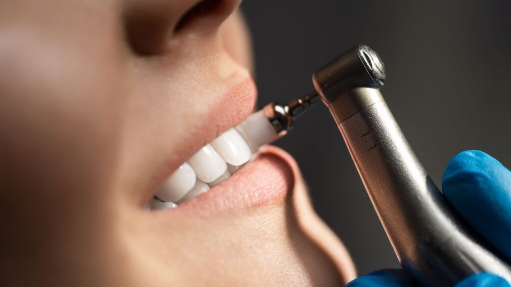 After scaling, the dentist performs a final polish. This involves using a slow-speed handpiece with a soft rubber cup and a gritty paste to smooth the tooth surfaces.